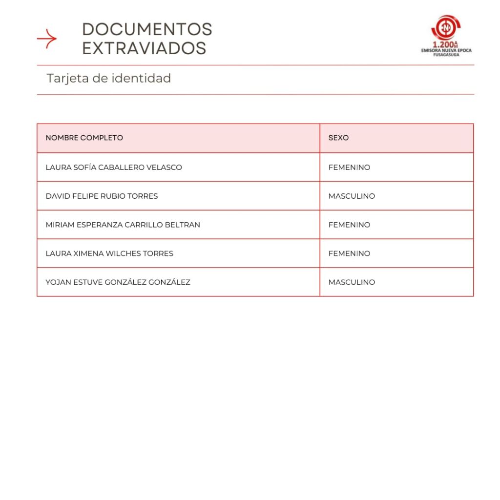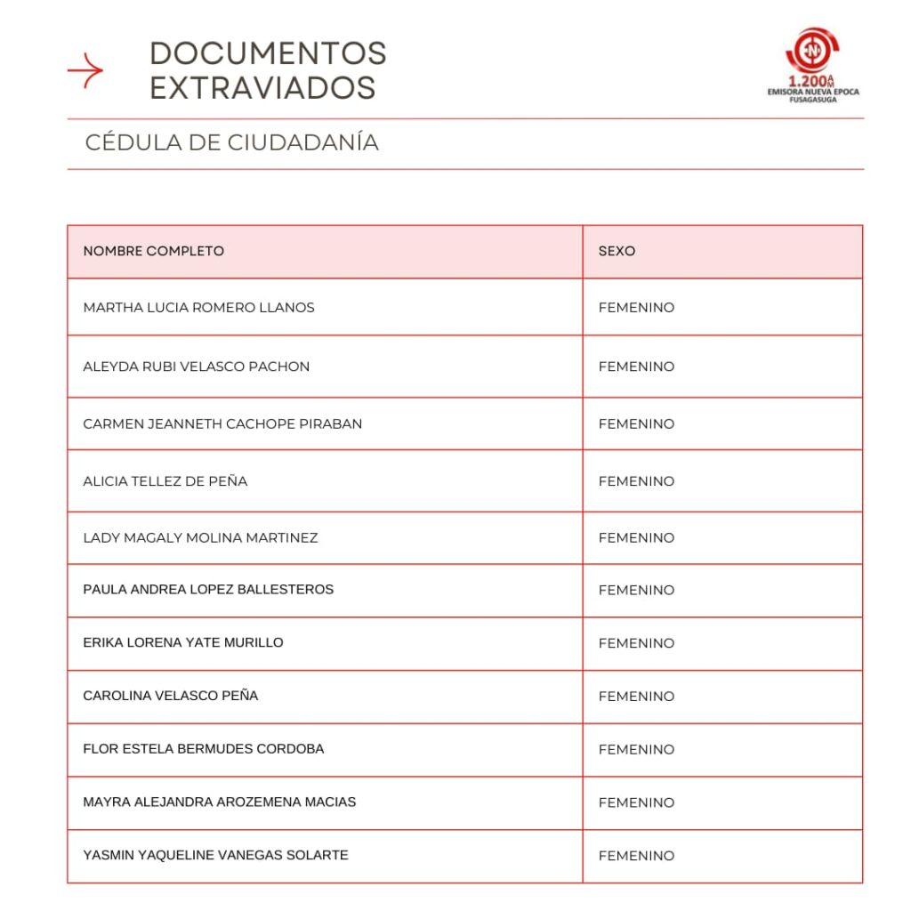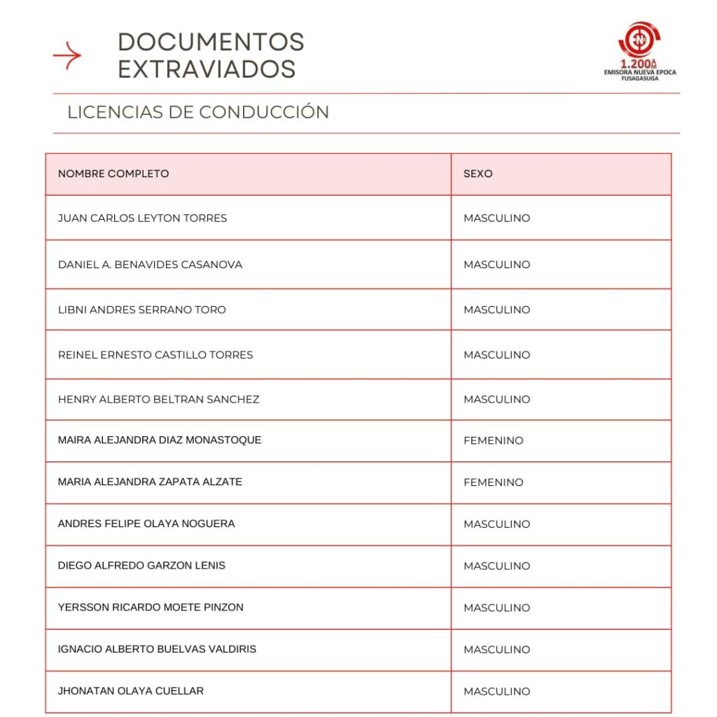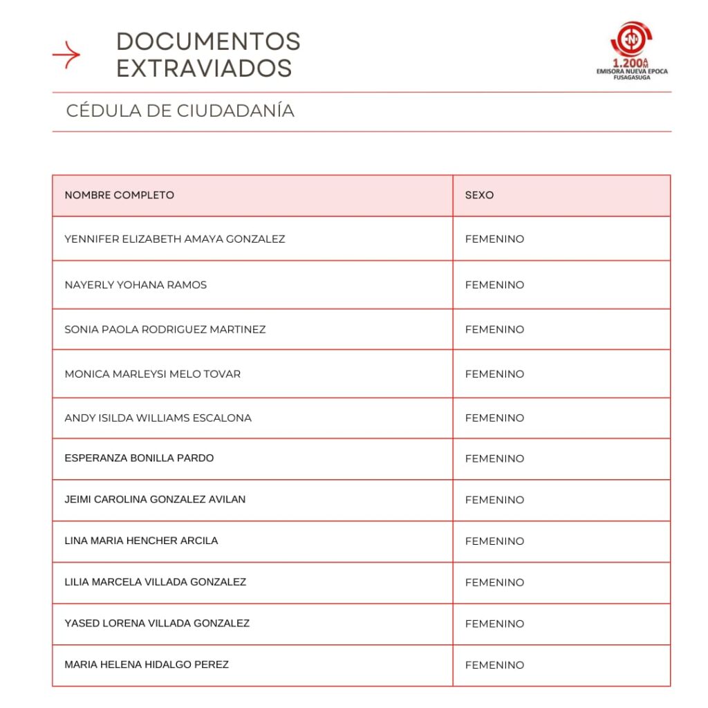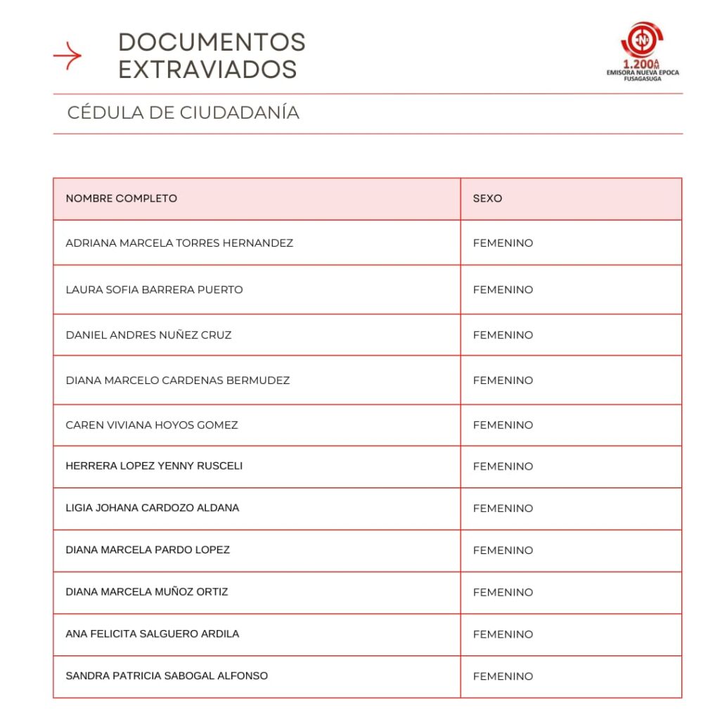 Listado de Documentos Extraviados que reposan en Emisora Nueva �poca en la Carrera 7 #5-32 Oficina 301 Centro Empresarial Santa Cruz Plaza, puedes pasar a reclamar tu cedula, licencia de conducci�n, tarjeta de identidad o licencia de tr�nsito si se encuentra en el listado en los horarios de 8:00 AM – 12:00 M, 2:00 PM – 6:00 PM entre semana, s�bado de 8:00 AM a 12:00 M.
