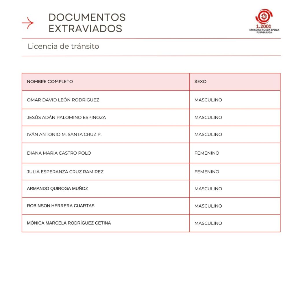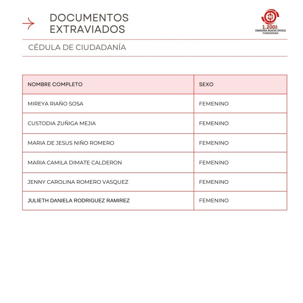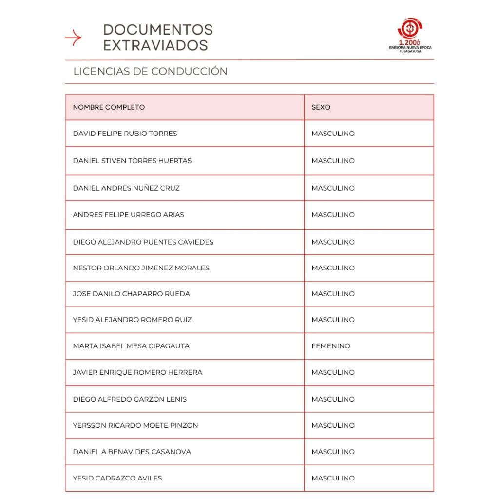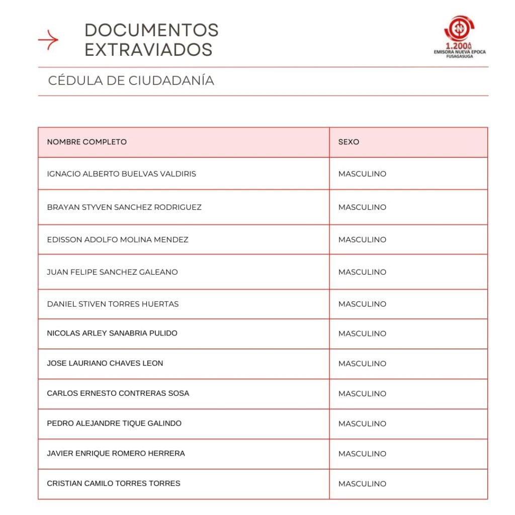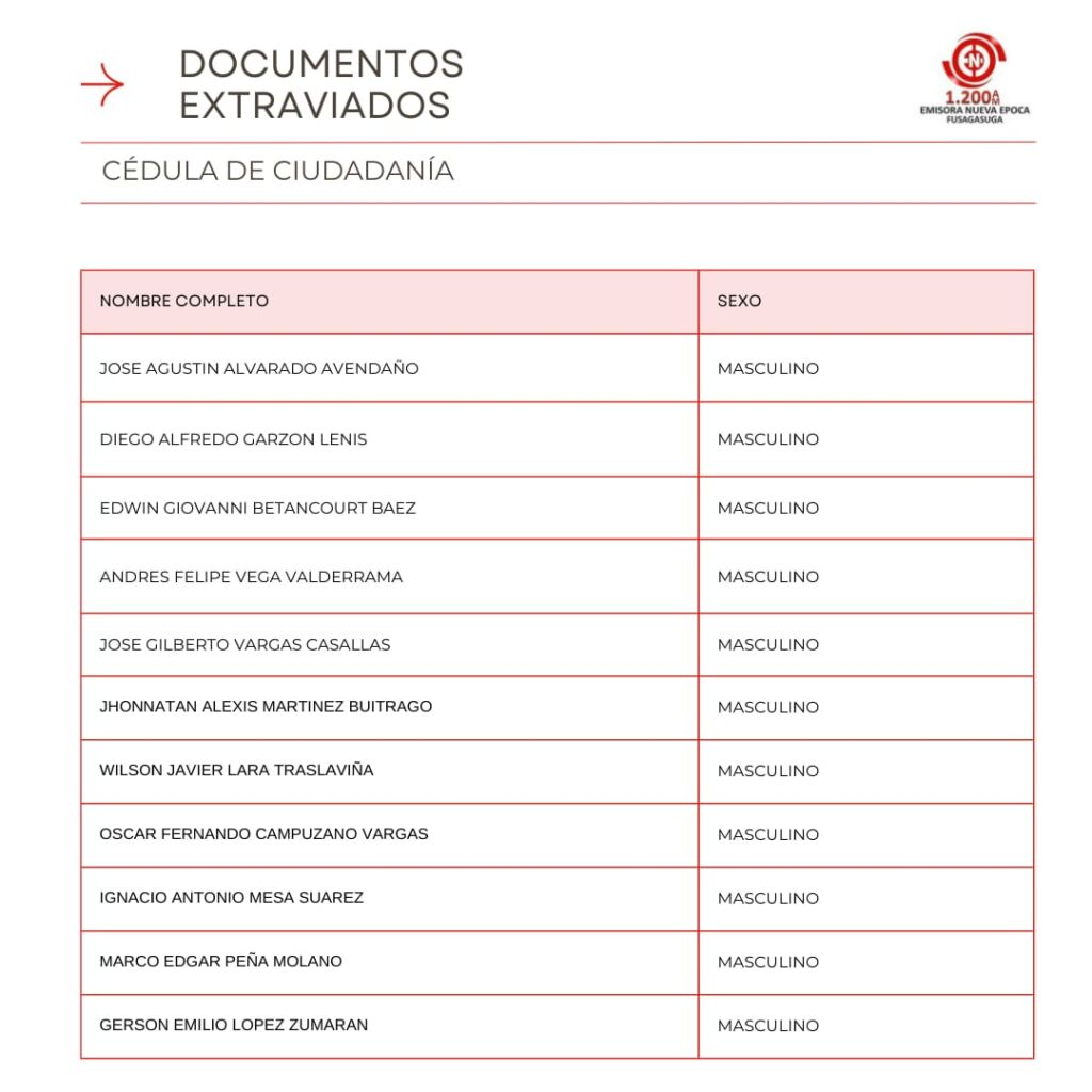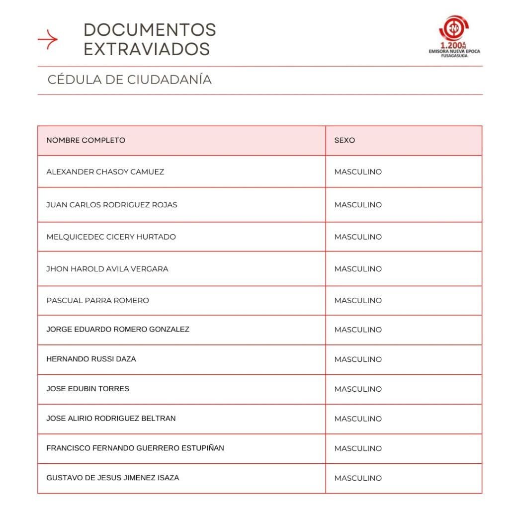Listado de Documentos Extraviados que reposan en Emisora Nueva �poca en la Carrera 7 #5-32 Oficina 301 Centro Empresarial Santa Cruz Plaza, puedes pasar a reclamar tu cedula, licencia de conducci�n, tarjeta de identidad o licencia de tr�nsito si se encuentra en el listado en los horarios de 8:00 AM – 12:00 M, 2:00 PM – 6:00 PM entre semana, s�bado de 8:00 AM a 12:00 M.